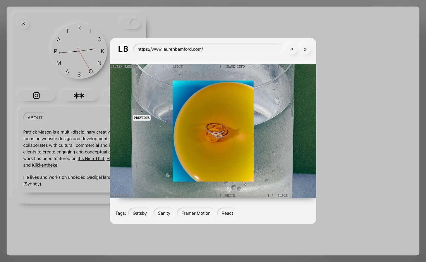 Patrick Mason 是悉尼的多学科创意专业人士,专注于网站设计和开发工作。他与文化、商业和个人客户合作,创造引人入胜且富有概念性的设计作品。网站首页采用了独特的时钟设计,表盘数字被替换成他的名字。