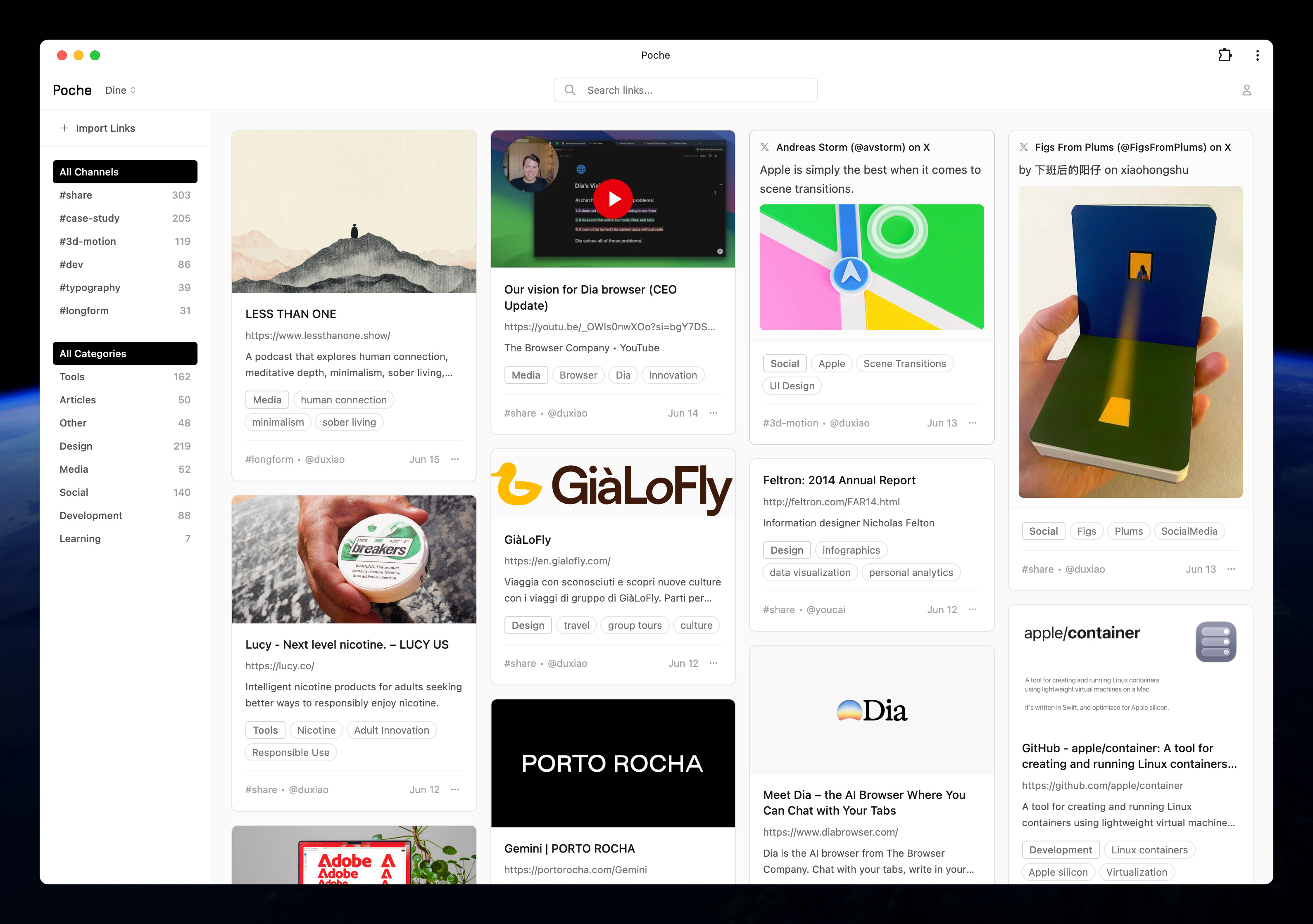 我们又有新 app 啦!Poche 可以帮忙把团队 Slack 里分享的外部链接自动抓取并用 AI 分类和标签,并且有搜索功能可以方便检索。