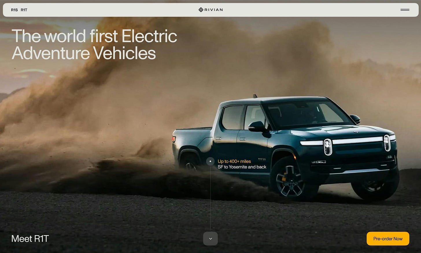 Rivian by REJOUICE — REJOUICE 为电动车品牌 Rivian 打造的品牌首秀展示了其前瞻性的创新力、树立其未来汽车制造商的媒体与投资者信心,并推动预订转化。以「首款电动冒险车辆」为主题,从品牌战略到动效与 3D 可视化到内容制作,系统性搭建其数字化品牌基础。