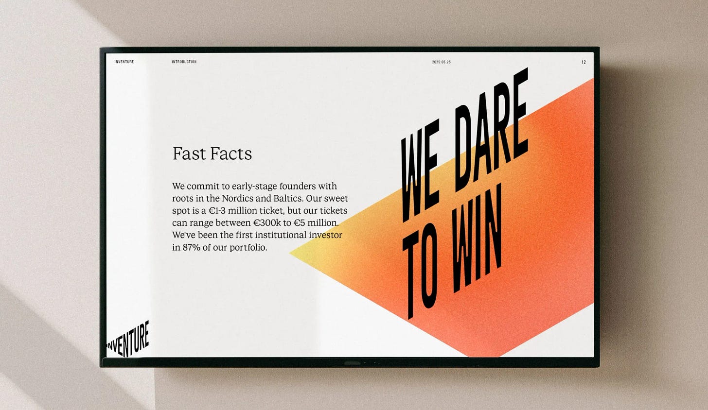 Inventure by Bedow — 北欧风投公司 Inventure 立足芬兰、瑞典和英国,核心关注斯堪的纳维亚和波罗的海地区这一独角兽密集区域。在视觉层面,点燃与加速成为标志设计的基石:字标前半部分像火花点燃,后半部分则向前倾斜、向上加速,形成简洁而有动势的造型。