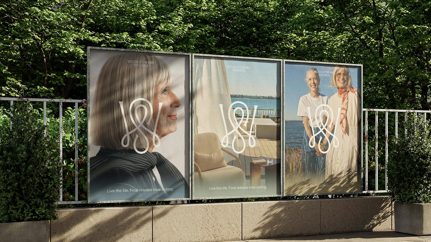 Woolooware Shores by Frost* Collective — 如何在不说退休的前提下推销退休社区?Frost 为悉尼海滨项目 Woolooware Shores 找到的答案是重新定义老年生活的视觉语言。时装摄影师 Dan Roberts 掌镜的肖像广告刻意回避了养老行业惯用的温馨柔焦,转而以时尚大片的质感拍摄七八十岁的真实居民。配合「Well I’ll be.」这句既感慨又自得的文案,品牌成功地将目标受众从「需要照顾的人」重新定位为「值得羡慕的人」。