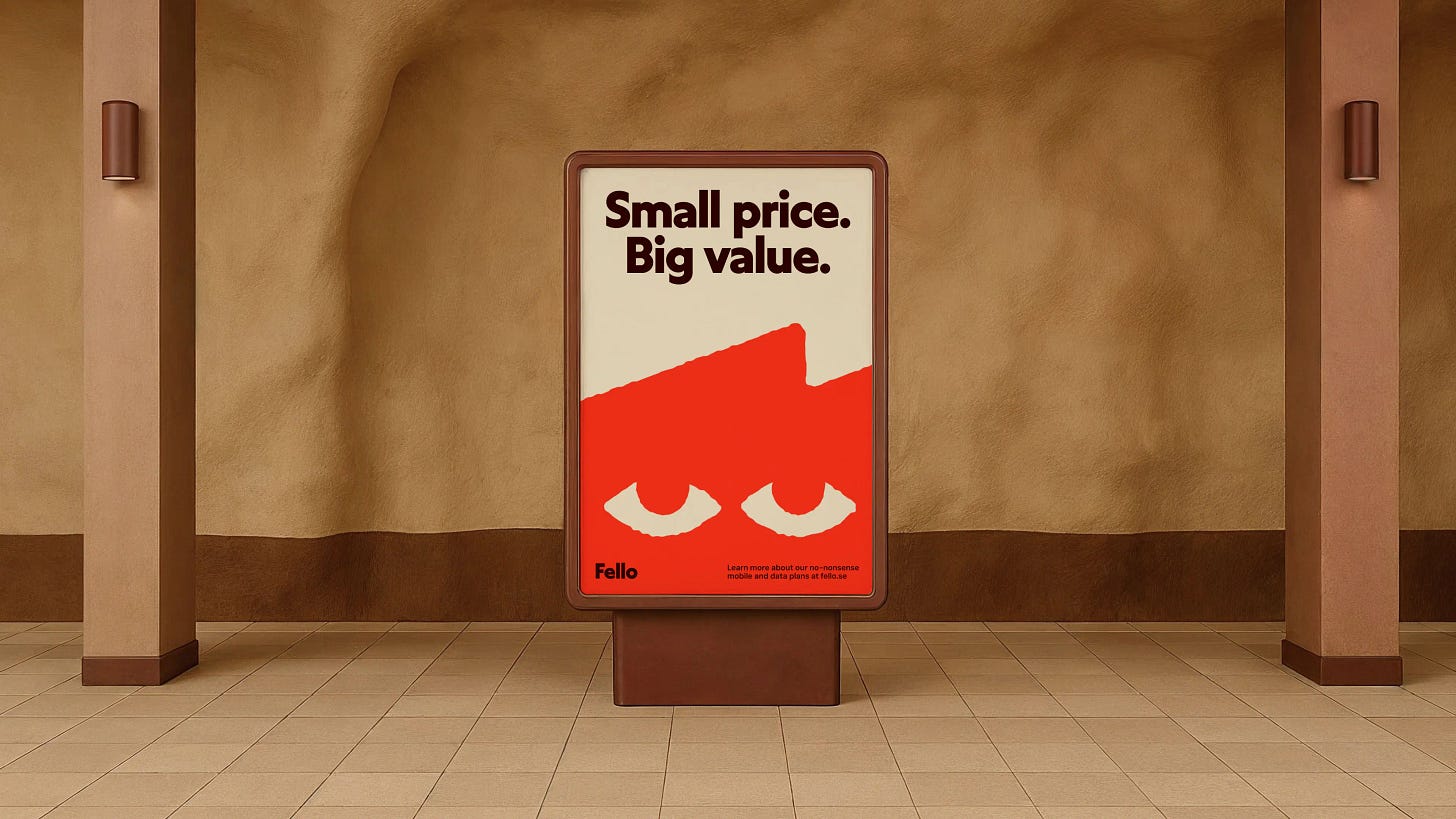Fello by Bold Scandinavia — 瑞典低价运营商 Fello 的品牌焕新,最大亮点是一个手绘对话气泡形状的吉祥物。这个话痨的小家伙不仅是品牌符号,还直接参与版式编排,作为图形元素撑起了整套灵活的视觉系统。配合明快的色彩让整套形象看起来像是一个你愿意跟他聊天的朋友,而不是一家只想让你续费的运营商。