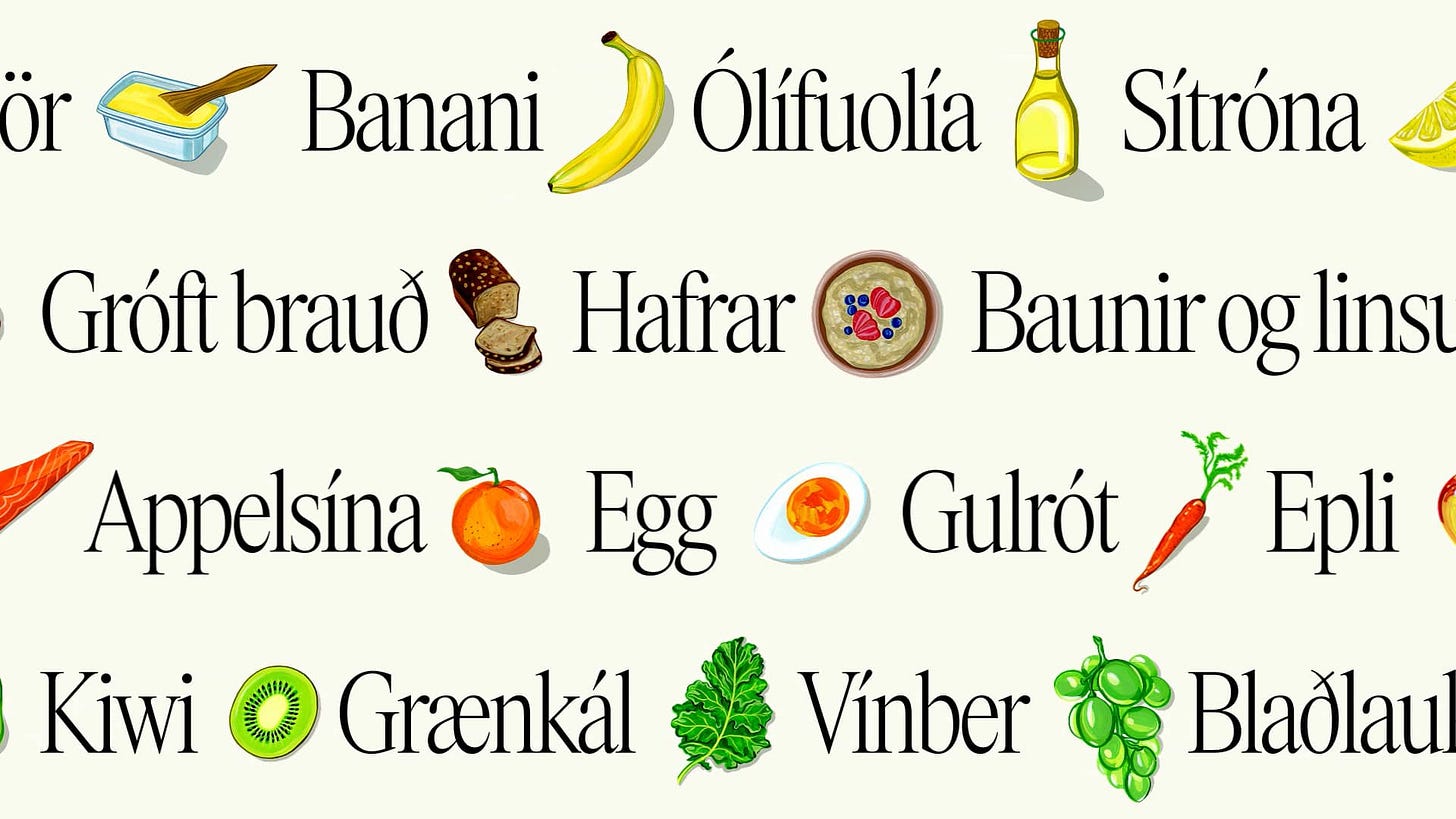 Dietary Guidelines by Aton — 冰岛卫生局每十年更新一次膳食指南,这次视觉形象由雷克雅未克的 Aton 负责。插画师 Fanny Gentle 手绘的食物插画明亮生动,配合 Favorit 无衬线字体和经典食谱风格的排版,传达出一种平静又充满生活气息的氛围。作为冰岛人从小学教室就开始盯着看的文化符号,这次的更新既保留了怀旧感又很当代。