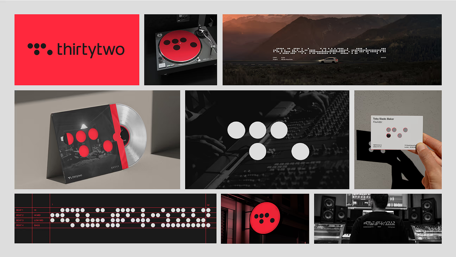 Thirty Two Music by YeahNice — 伦敦工作室 YeahNice 为音乐代理公司 Thirty Two Music 打造了一套把声音本身变成视觉的识别系统。灵感取自钢琴纸卷、音乐盒的冲孔带与 step sequencer,那些早于屏幕时代的音乐记录工具。他们自建了一个工具把任意音频实时转换成 32×4 点阵图案,四行分别对应高频到低频的频谱。印刷物嫁接纸卷的冲切工艺,每一份应用都独一无二,却仍属于同一种声音。